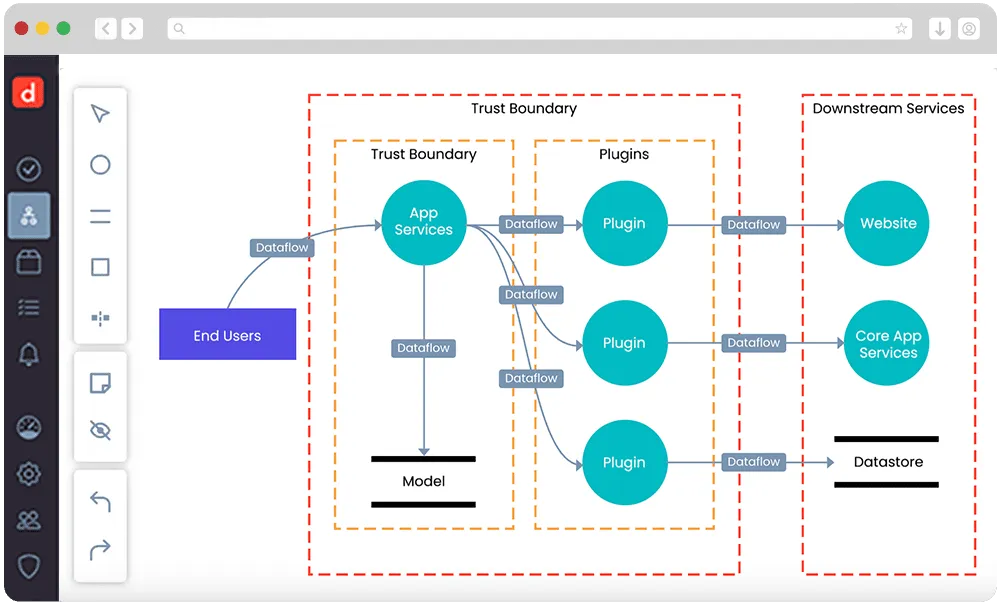 - Devici Canvas: Modern bir diyagram aracı. Veri akış diyagramları oluşturabilir, öğelere tehdit ve önlem atayabilir, modelin sağlık ve kapsamını tek ekrandan görebilirsiniz.