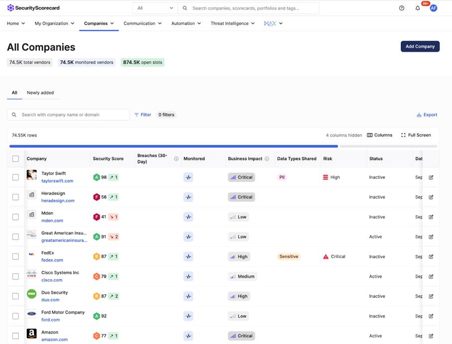 Security Scorecard platformunda “Companies > All Companies” yolundan ilerleyebilirsiniz.